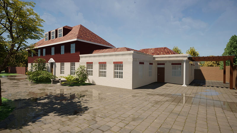 - A traditional rear elevation that continues the classical language.