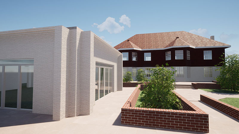 A standout element of the project is the landscape-led approach to accessibility, where the garden design resolves the level change between the existing home and the new lower-level extension. A curved ramp, framed by generous flower beds, creates a soft, promenade-like transition between levels. This approach not only reduces the visual impact of the ramp but adds a sense of movement and cohesion across the outdoor spaces and the two levels of the proposed house.